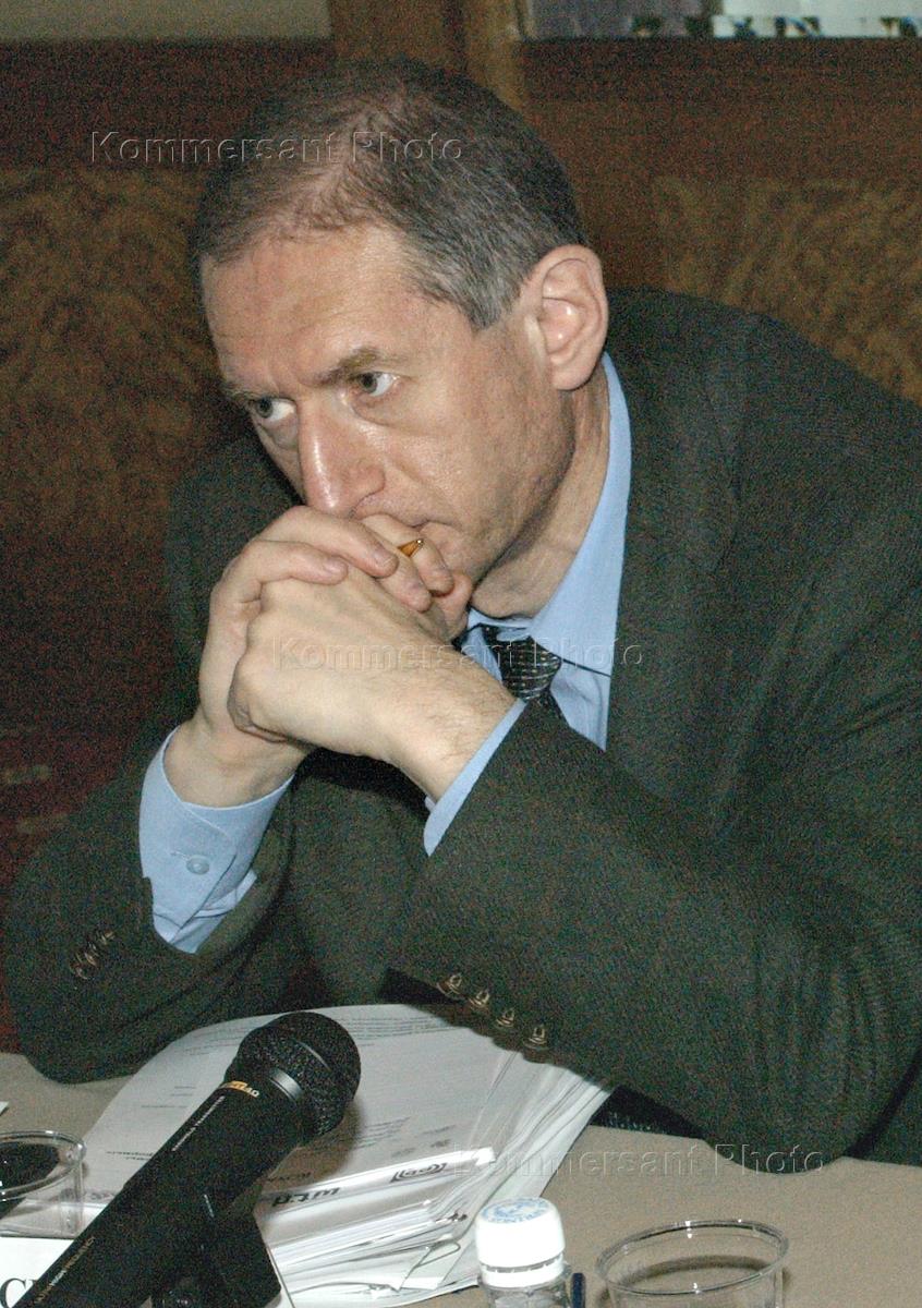Chairman of the Sberbank governing board Andrey Kazmin (left) and vice chairman of the State Duma Creditors and Financial Markets Committee Pavel Medvedev (right) take part in the round table conference headlined 'Pressing Issues in the Russian Banking System - Transsitional Results of the Reform'. The meeting took place in the Pskov Hall of the National Hotel.