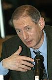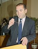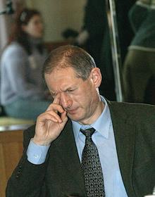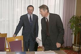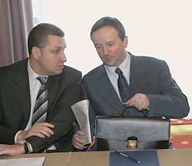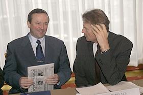 Vice president of Sobinbank Konstantin Kozhevnikov (left) and chairman of the Sberbank governing board Andrey Kazmin (right) take part in the round table conference headlined 'Pressing Issues in the Russian Banking System - Transsitional Results of the Reform'. The meeting took place in the Pskov Hall of the National Hotel.