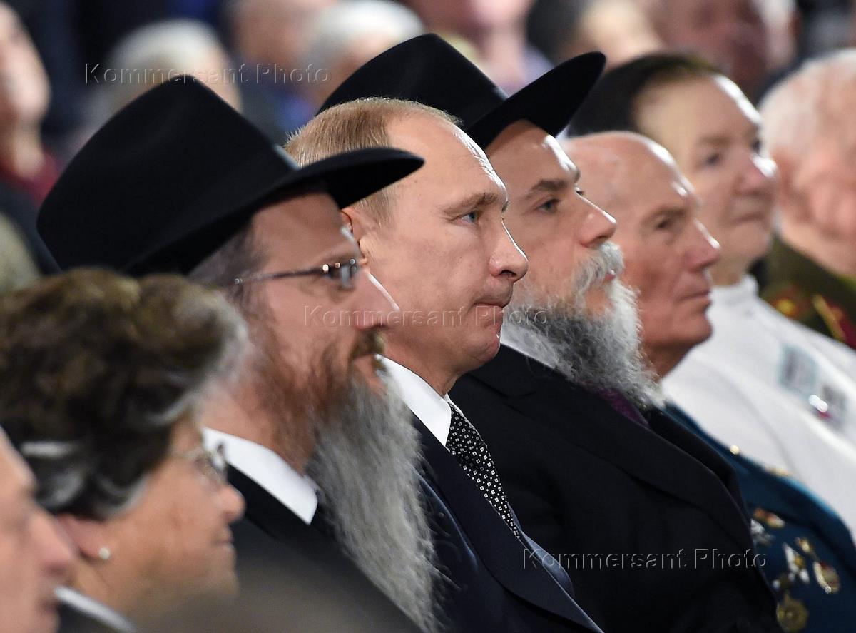 Слева направо: главный раввин России Берл Лазар, президент России Владимир Путин, президент федерации еврейских общин России (ФЕОР) Александр Борода на церемонии зажжения свечей памяти жертв Холокоста, в день 70-й годовщины освобождения советскими войсками узников Освенцима, в Еврейском музее и центре толерантности.