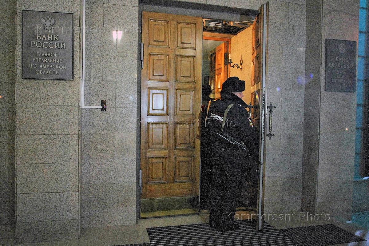 Сотрудник полиции у здания управления Центробанка России по Амурской области. Заместитель руководителя главного управления Центробанка России по Амурской области застрелил трех сотрудников и покончил с собой.