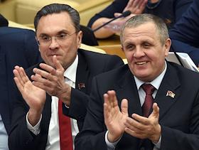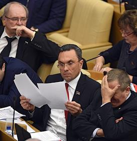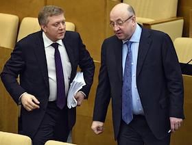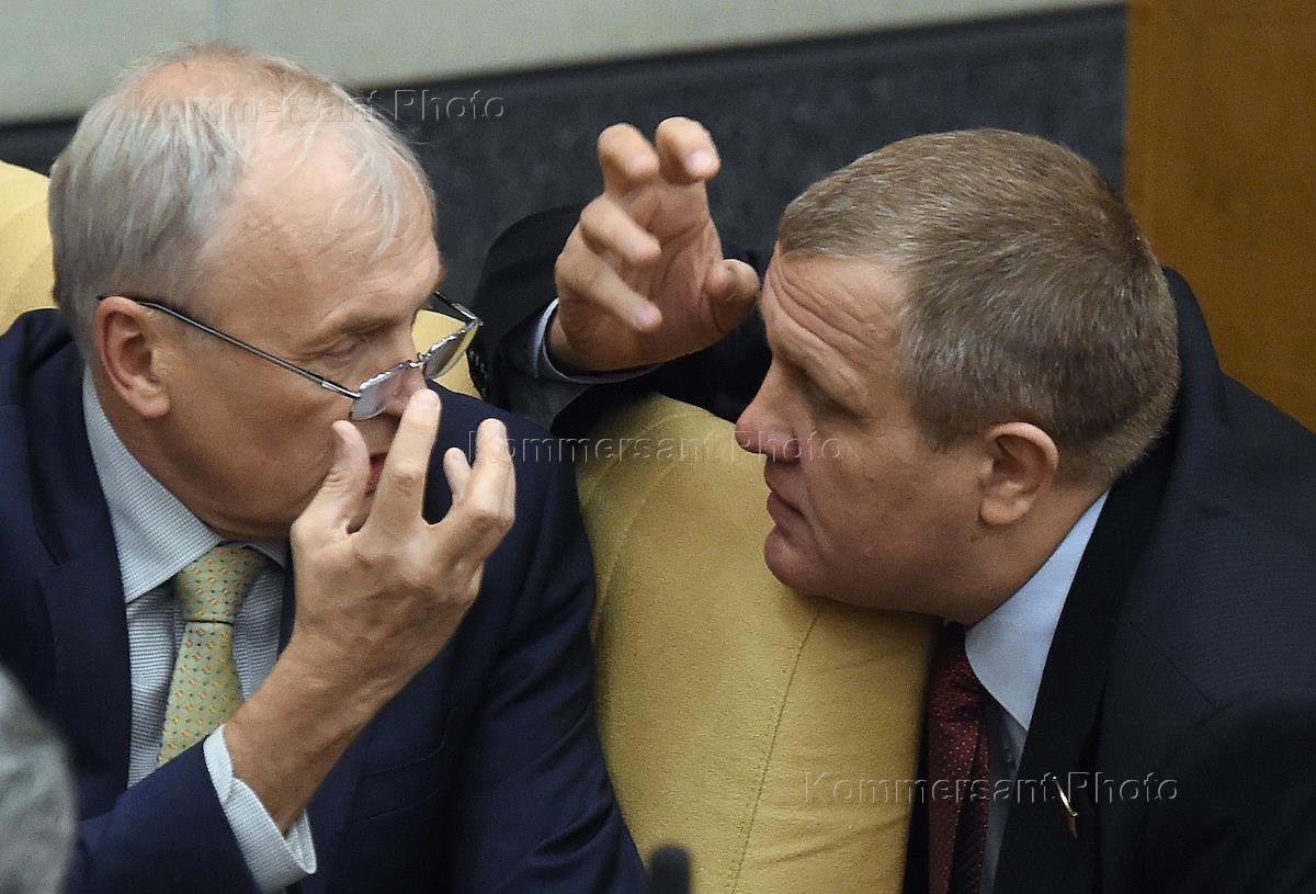 Заместитель председателя комитета Государственной думы (ГД) России по конституционному законодательству и государственному строительству Дмитрий Вяткин (слева) и председатель комитета ГД России по конституционному законодательству и государственному строительству Владимир Плигин (справа) на пленарном заседании Госдумы России.