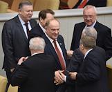 Пленарное заседание Государственной думы России. Слева направо: лидер Либерально-демократической партии России (ЛДПР), член комитета Государственной думы (ГД) России по обороне Владимир Жириновский, член комитета ГД России по делам общественных объединений и религиозных организаций Виталий Золочевский, председатель комитета ГД России по делам общественных объединений и религиозных организаций Ярослав Нилов, лидер Коммунистической партии России (КПРФ), член комитета ГД России по науке и наукоемким технологиям Геннадий Зюганов и первый заместитель председателя комитета ГД России по информационной политике, информационным технологиям и связи Вадим Деньгин на заседании.