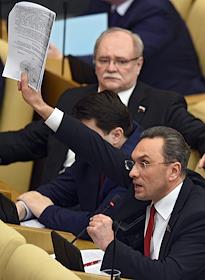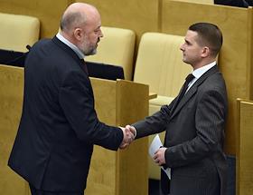 Председатель комитета Государственной думы (ГД) России по гражданскому, уголовному, арбитражному и процессуальному законодательству Павел Крашенинников (слева) и председатель комитета ГД России по делам общественных объединений и религиозных организаций Ярослав Нилов (справа) на пленарном заседании Госдумы России.