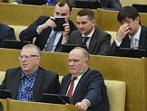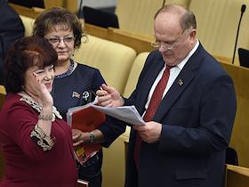 Лидер Коммунистической партии России (КПРФ), член комитета Государственной думы России по науке и наукоемким технологиям Геннадий Зюганов (в центре) на пленарном заседании Госдумы России.