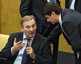 Член комитета Государственной думы (ГД) России по физической культуре, спорту и делам молодежи Владислав Третьяк (слева) и первый заместитель председателя комитета ГД России по информационной политике, информационным технологиям и связи Вадим Деньгин (справа) на пленарном заседании Госдумы России.