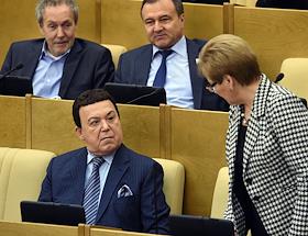 Пленарное заседание Государственной думы России. Слева направо: член комитета Государственной думы (ГД) России по труду, социальной политике и делам ветеранов Валерий Трапезников, первый заместитель председателя комитета ГД по культуре Иосиф Кобзон и член комитета ГД по природным ресурсам, природопользованию и экологии Александр Фокин на заседании.