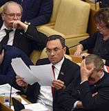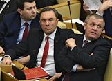 Пленарное заседание Государственной думы России. Слева направо: член комитета Государственной думы (ГД) России по природным ресурсам, природопользованию и экологии Олег Лебедев, член комитета ГД по обороне Владимир Бессонов и заместитель председателя комитета ГД России по труду, социальной политике и делам ветеранов Николай Коломейцев на заседании.