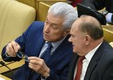 Член комитета Государственной думы (ГД) России по безопасности и противодействию коррупции Владимир Васильев (слева) и лидер Коммунистической партии России (КПРФ), член комитета ГД России по науке и наукоемким технологиям Геннадий Зюганов (справа) на пленарном заседании Госдумы России.