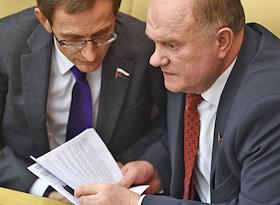 Заместитель председателя Государственной думы (ГД) России Николай Левичев (слева) и лидер Коммунистической партии России (КПРФ), член комитета ГД России по науке и наукоемким технологиям Геннадий Зюганов (справа) на пленарном заседании Госдумы России.