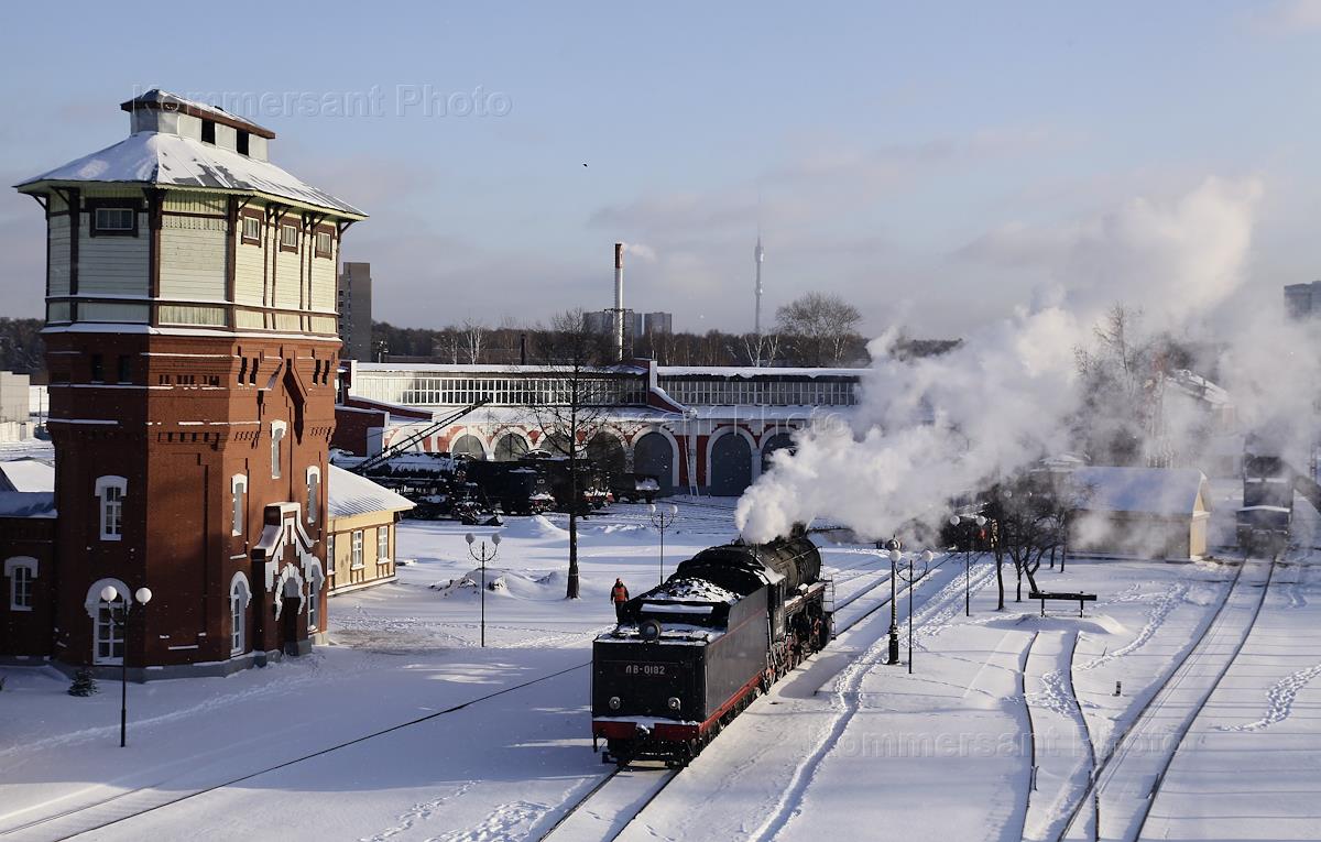 Паровоз в Московском паровозном депо "Подмосковная". Рабочий убирает снег с железнодорожных путей.