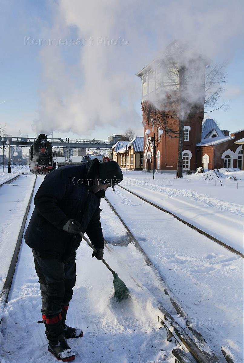 Паровоз в Московском паровозном депо "Подмосковная". Рабочий убирает снег с железнодорожных путей.