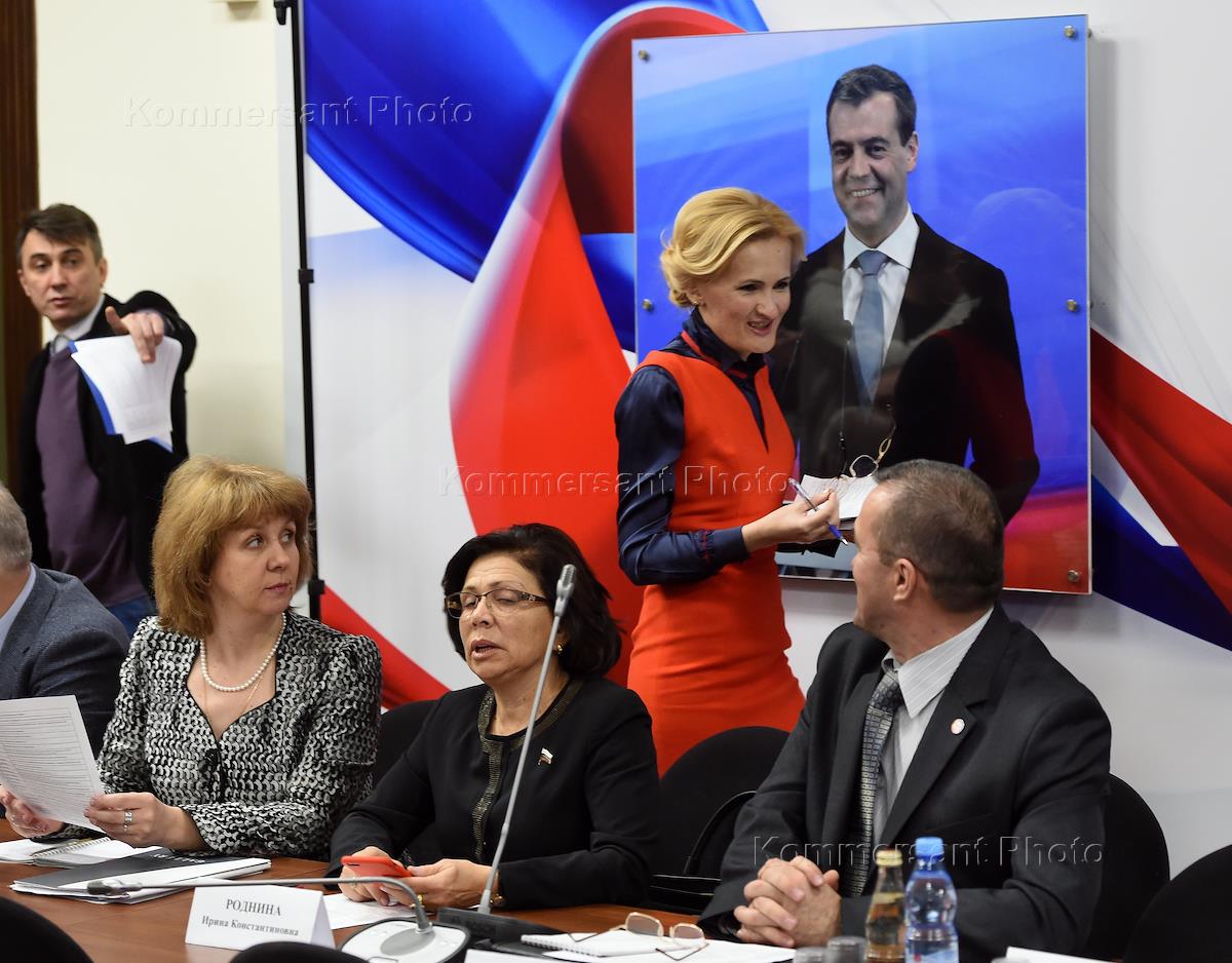 Председатель комитета Государственной думы (ГД) России по безопасности и противодействию коррупции, член Президиума Генсовета "Единой России" Ирина Яровая (слева) и председатель комитета ГД по регламенту и организации работы Государственной Думы Сергей Попов (в центре) на заседании Патриотической платформы партии "Единой России" по теме "Единая страна – единое образовательное пространство". Заседание прошло в здании Госдумы.