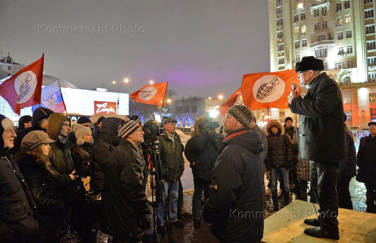 Акция в защиту свободы собраний и за восставший Донбасс прошла в рамках "Стратегии-31" на Триумфальной площади. Председатель политической партии "Другая Россия", писатель Эдуард Лимонов (слева) во время проведения акции.