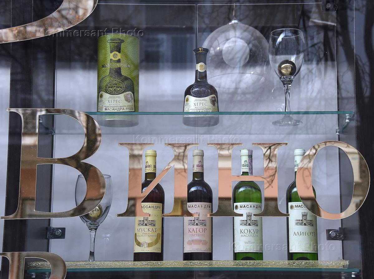 Жанровая фотография. Витрина винного магазина с продукцией завода "Массандра".