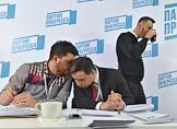 Отчетно-выборный съезд партии "Партия Прогресса" прошел в деловом центре "Омега-плаза". Председатель партии Алексей Навальный (справа) и секретарь партии Дмитрий Крайнев (в центре) на заседании съезда.