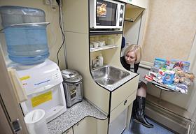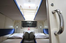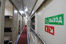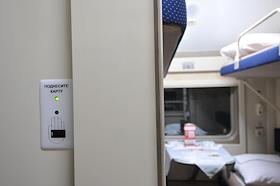 Внутренний интерьер купевагона первого двухэтажного поезда сообщением Санкт-Петербург - Москва. Поезд во время отправления с Московского вокзала.