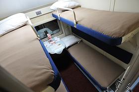 Внутренний интерьер купе вагона первого двухэтажного поезда сообщением Санкт-Петербург - Москва. Поезд во время отправления с Московского вокзала.