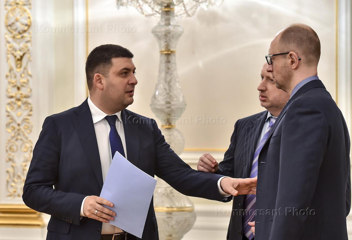 Слева направо: председатель Верховной Рады Украины Владимир Гройсман, секретарь Совета национальной безопасности и обороны Украины Александр Турчинов и премьер-министр Украины Арсений Яценюк перед началом заседания Национального Совета реформ.