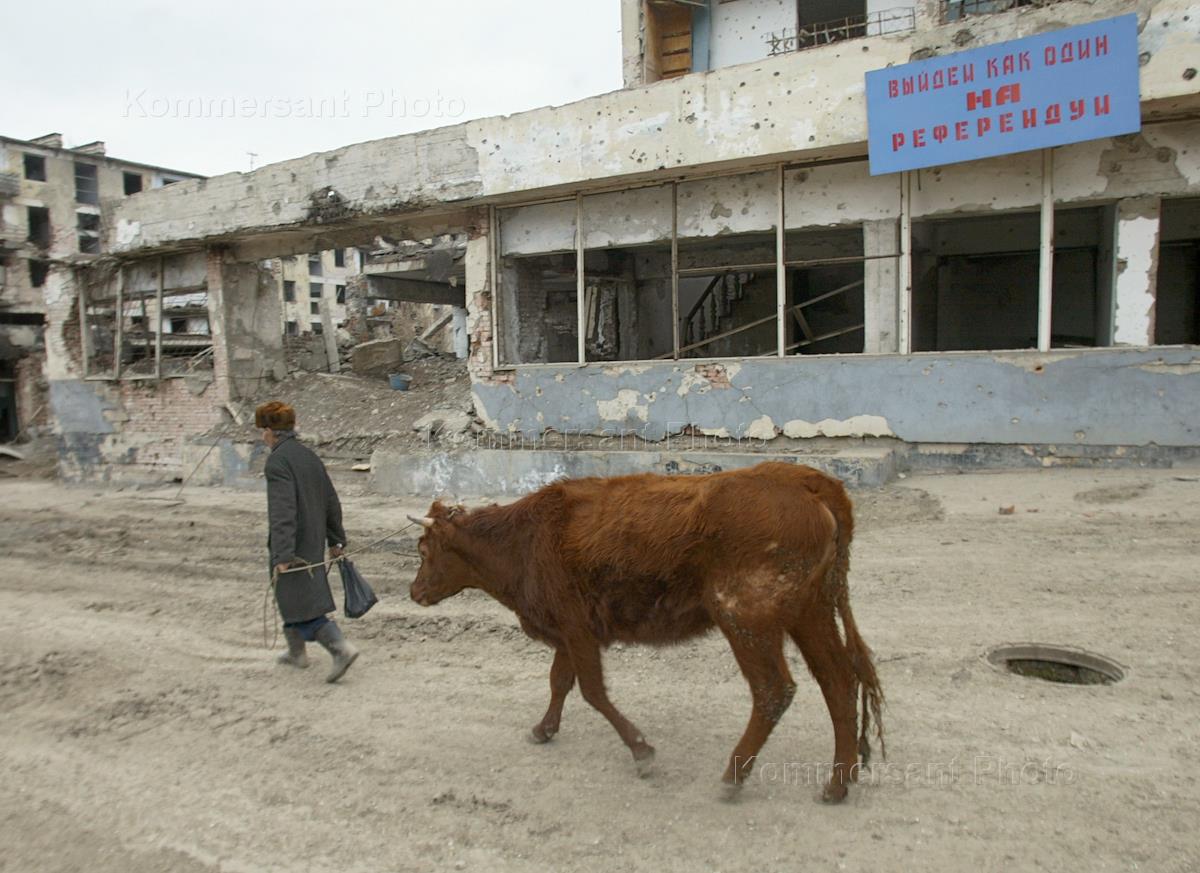 A resident of the Chechen capital Grozny walks leads his cow past a poster urging Chechens to take part in the referendum on the new constitution of Chechnya.