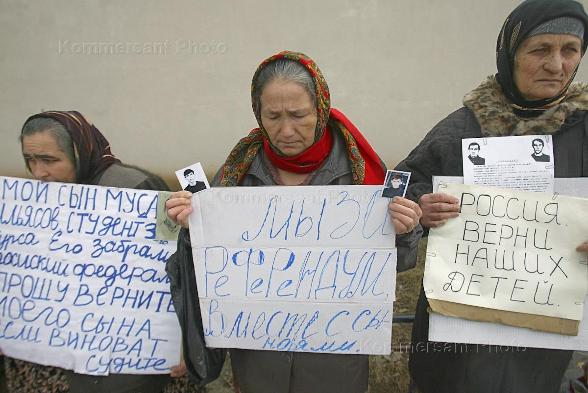 Проведение референдума о принятии конституции Чечни. Жители Чечни во время голосования.