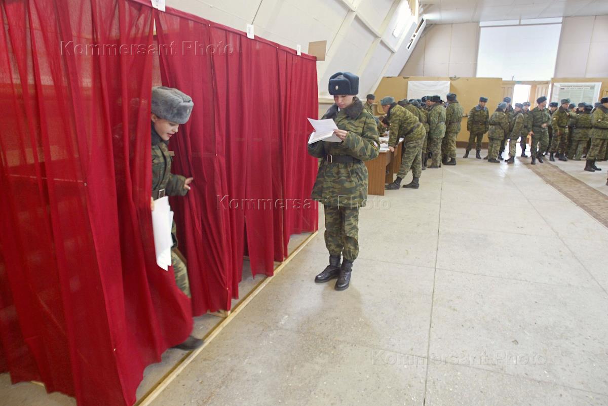 Russian military servicemen come to a voting station to cast votes during the referendum on the new constitution of the Chechen Republic.