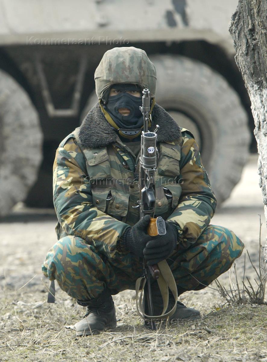A masked officer of the Russian Interior Force patrols the streets of Grozny in the run up to the referendum on the Chechen Republic constitution.