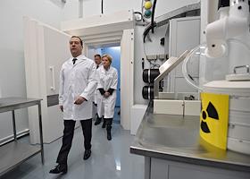 Рабочая поездка председателя правительства России Дмитрий Медведева в Уфу. Дмитрий Медведев во время посещения Центра ядерной медицины.