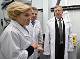 Рабочая поездка председателя правительства России Дмитрий Медведева в Уфу. Дмитрий Медведев (в центре) и руководитель филиала ООО "ПЭТ-Технолоджи" в городе Уфе Елена Елхова (справа) во время посещения Центра ядерной медицины.