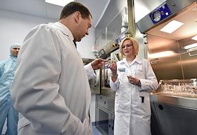 Рабочая поездка председателя правительства России Дмитрий Медведева в Уфу. Дмитрий Медведев (слева) и руководитель филиала ООО "ПЭТ-Технолоджи" в городе Уфе Елена Елхова (справа) во время посещения Центра ядерной медицины.