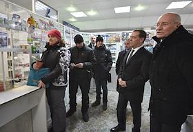 Рабочая поездка председателя правительства России Дмитрия Медведева в Уфу. Дмитрий Медведев (второй справа) и президент республики Башкортостан Рустэм Хамитов (справа) во время посещения аптеки.