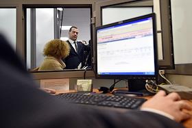Рабочая поездка председателя правительства России Дмитрий Медведева в Уфу. Дмитрий Медведев во время посещения Отделения Пенсионного фонда по Республике Боршкортостан.