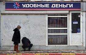 Жанровая фотография. Люди у павильона с вывеской "Удобные деньги".