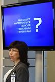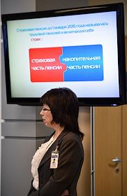 Рабочая поездка председателя правительства России Дмитрий Медведева в Уфу. Cотрудник пресс-службы Отделения Пенсионного фонда по Республике Боршкортостан Эльвира Фазлутдинова во время посещения Дмитрия Медведева пенсионного фонда Республики Башкортостан. Надпись на экране "Как будет назначаться пенсия по новым правилам?".