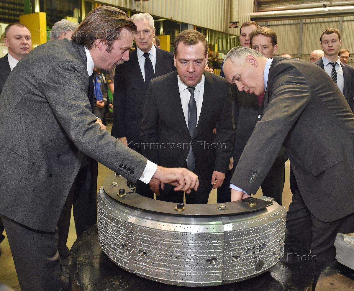Рабочая поездка председателя правительства России Дмитрия Медведева в Воронеж. Слева направо: генеральный директор Pirelli Tyre Russia Аймоне ди Савойя Аоста, председатель правительства России Дмитрий Медведев и генеральный директор Воронежского шинного завода Юрий Грибанов во время посещения производственных цехов ЗАО "Воронежский шинный завод".