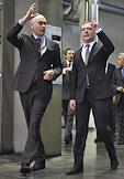 Рабочая поездка председателя правительства России Дмитрия Медведева в Воронеж. Генеральный директор Воронежского шинного завода Юрий Грибанов (слева) и председатель правительства России Дмитрий Медведев (справа) во время посещения производственных цехов ЗАО "Воронежский шинный завод".