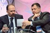 IV Российский инвестиционно-строительный форум (РИСФ-2015). Министр строительства и жилищно-коммунального хозяйства России Михаил Мень (слева) и заместитель мэра Москвы по вопросам градостроительной политики и строительства Марат Хуснуллин (справа) на форуме в Гостином Дворе.