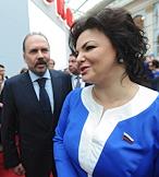 IV Российский инвестиционно-строительный форум (РИСФ-2015). Первый заместитель председателя комитета Государственной думы (ГД) России по жилищной политике и жилищно-коммунальному хозяйству Елена Николаева (слева) и министр строительства и жилищно-коммунального хозяйства России Михаил Мень (в центре) на форуме в Гостином Дворе.