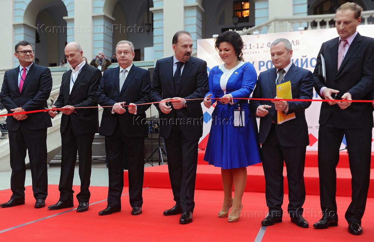 IV Российский инвестиционно-строительный форум (РИСФ-2015). Первый заместитель председателя комитета Государственной думы (ГД) России по жилищной политике и жилищно-коммунальному хозяйству Елена Николаева (третья слева) и министр строительства и жилищно-коммунального хозяйства России Михаил Мень (в центре) на форуме в Гостином Дворе.