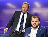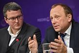 Директор Департамента государственной политики в сфере высшего образования Министерства образования и науки России Александр Соболев (слева) и руководитель Центра образовательных разработок бизнес-школы Сколково Денис Конанчук (справа) во время пресс-конференции, посвященной навигатору ведущих зарубежных университетов, участвующих в государственной программе "Глобальное образование".