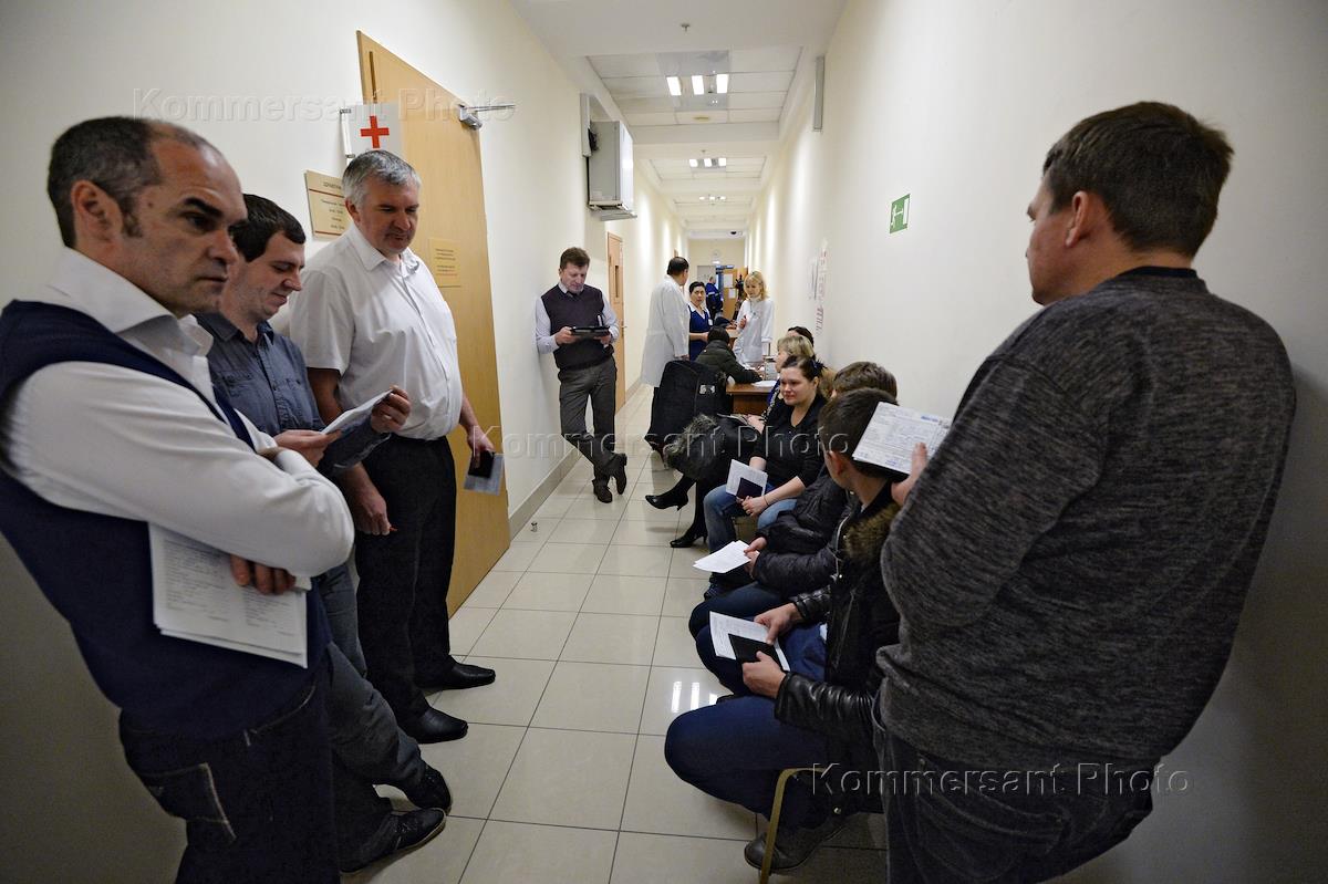Участники акции по сбору донорской крови с использованием передвижного модуля, организованной Министерством здравоохранения Московской области (МО). Акция прошла в здании Дома правительства МО.