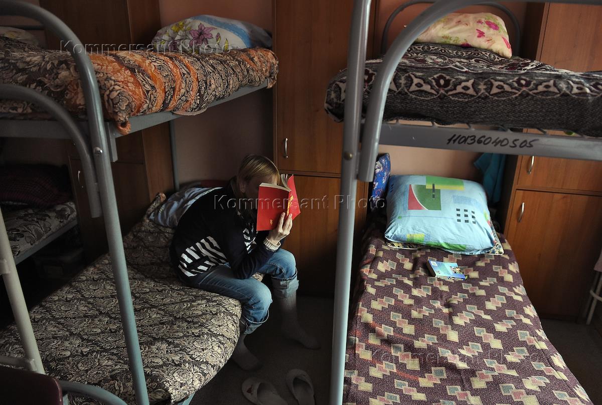 День открытых дверей в Центре социальной адаптации бездомных (ЦСА) "Люблино". Женщина в помещении для отдыха.