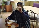 День открытых дверей в Центре социальной адаптации бездомных (ЦСА) "Люблино". Пожилая женщина пьет сок в столовой.