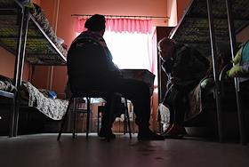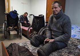 День открытых дверей в Центре социальной адаптации бездомных (ЦСА) "Люблино". Мужчины без ног на кровати в комнате для отдыха.