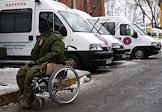 День открытых дверей в Центре социальной адаптации бездомных (ЦСА) "Люблино". Мужчины без ног на инвалидных колясках перед входом в центр.
