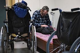 День открытых дверей в Центре социальной адаптации бездомных (ЦСА) "Люблино". Мужчина с костылями.