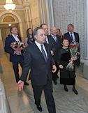 Министр спорта России Виталий Мутко (второй справа) и тренер по фигурному катанию Тамара Москвина (справа) во время празднования 80-летия Всероссийской федерации художественной гимнастики, единственного олимпийского вида спорта, рожденного в России. Празднование прошло на сцене Мариинского театра.