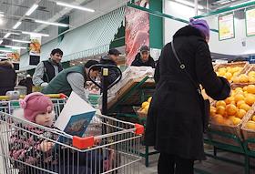 Покупатели в овощном отделе гипермаркета "О'Кей" в торговом комплексе "Водный" у станции метро "Водный стадион".