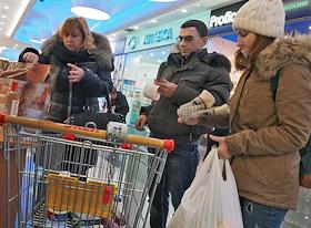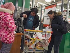 Покупатели на выходе из гипермаркета "О'Кей" в торговом комплексе "Водный" у станции метро "Водный стадион".