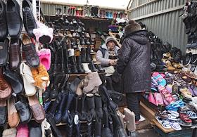 Коптевский колхозный рынок. Покупатели у торговой палатки обувью. Женщина покупает тапочки.