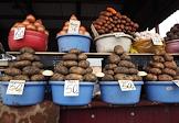 Коптевский колхозный рынок. Торговая палатка с овощами. Витрина с разными сортами картофеля.